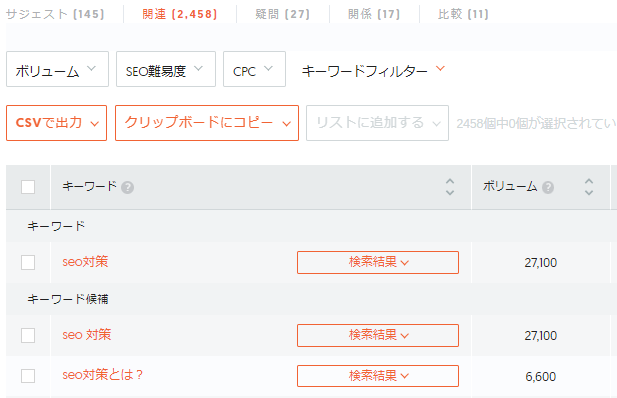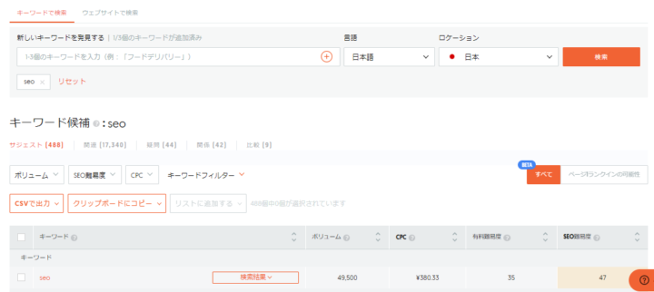 UberSuggestでSEOと検索すると、サジェストキーワードが488件、関連キーワードが17,340件ヒットしました。ここで表示されたキーワードを確認すると、ユーザーニーズを知ることもできます。