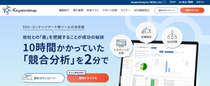 Keywordmap(キーワードマップ)は、dodaなどの大手企業も利用している、SEOキーワード選定ツールです。サジェストキーワードや関連キーワードの調査はもちろん、消費者ニーズの調査や広告情報の確認などもおこなえます。