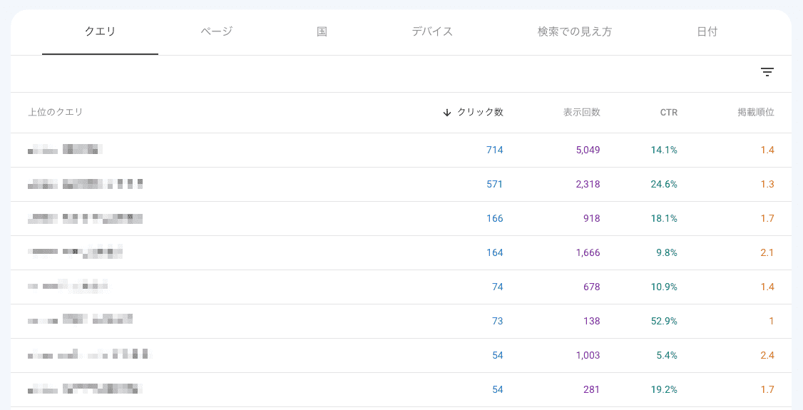 ページや期間を指定することで、クリック数や平均順位などが確認できます。