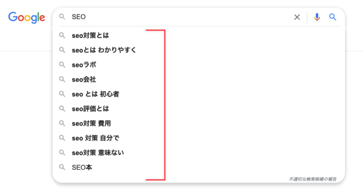 サジェストキーワードとは、検索エンジンで検索窓にキーワードを入力した際に表示される「候補キーワード」のことで、Googleオートコンプリートとも呼びます。