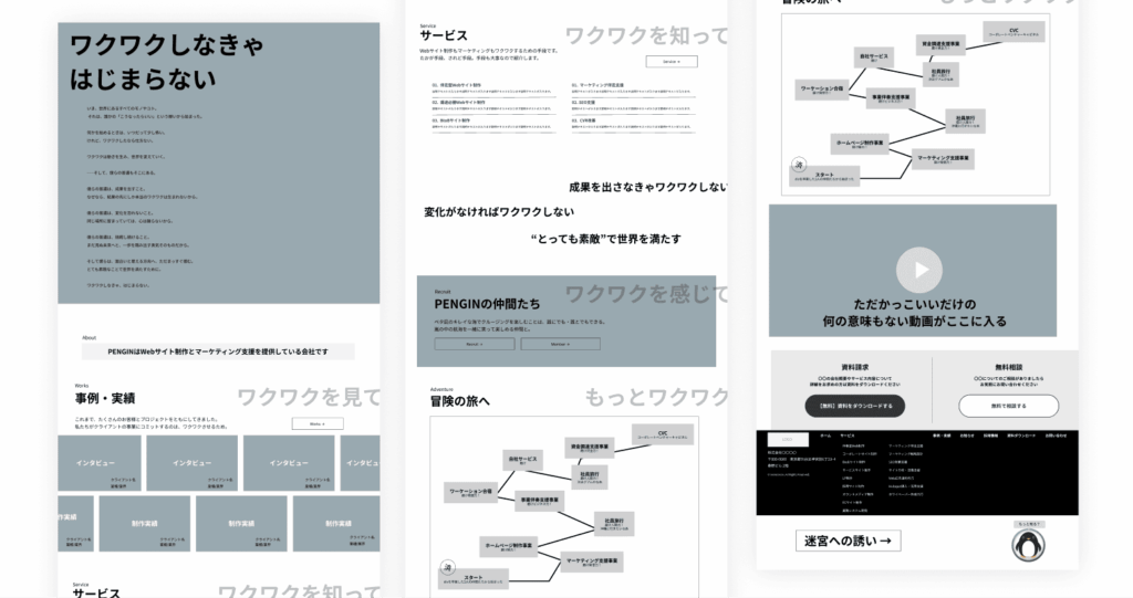必要なページが決まったら、ワイヤーフレームを作成します。実際にワイヤーフレームに落とし込んでみると「このページ、弱くない?この内容だったらいらないのでは?」というようなページがいくつか出てきました。