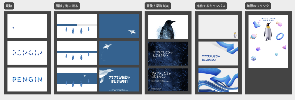 これらのデザインイメージから、しっくりくるキーワードやビジュアルイメージ、我々が「PENGINっぽい」と感じるものを選び、ブラッシュアップしていく形でデザインの制作を進めていきました。
